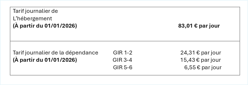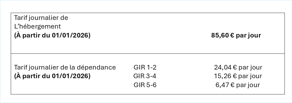 Le tarif hébergement, correspondant à la prestation hôtelière (restauration, chambre, entretien). Il est unique et est payé par le résident.